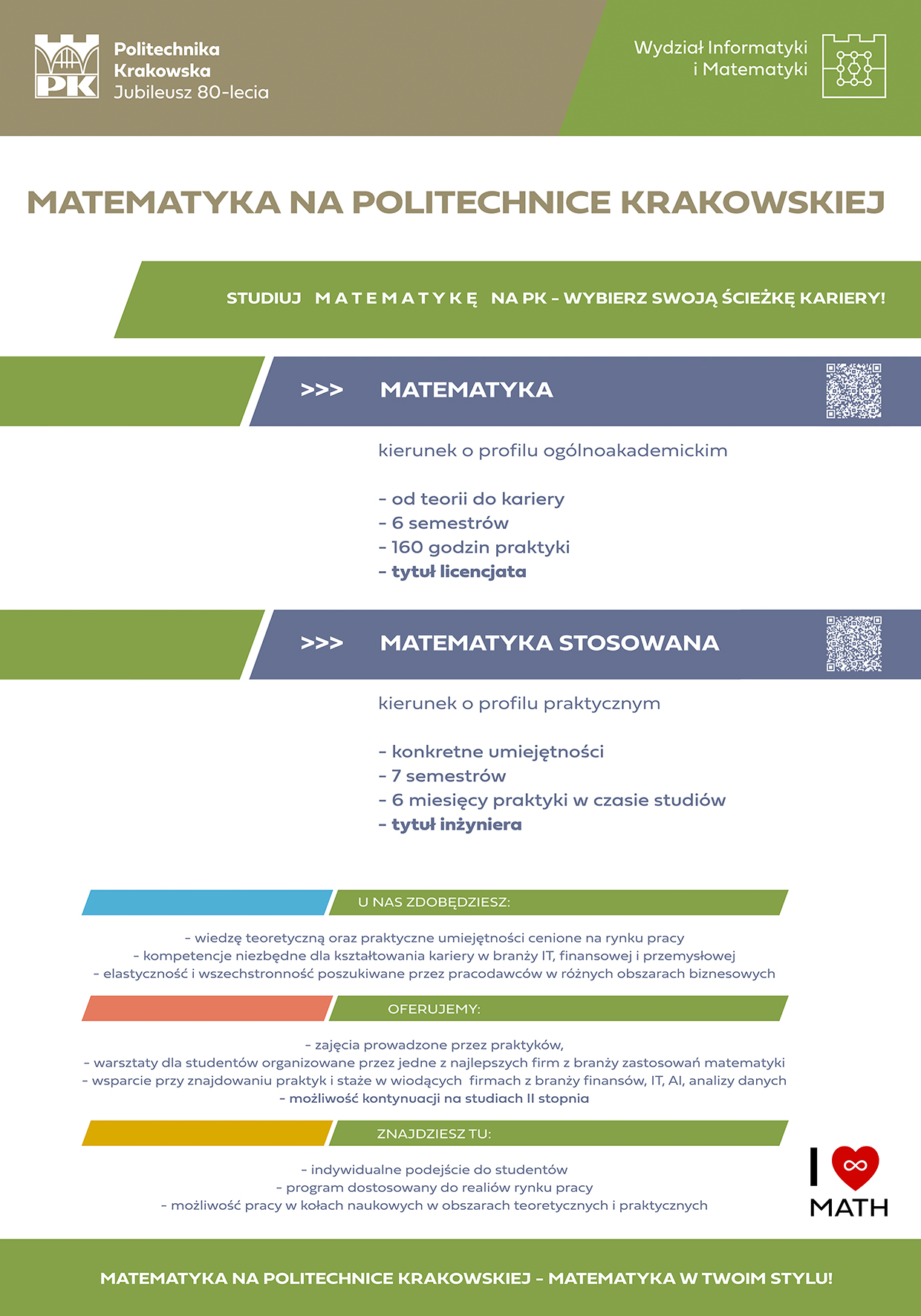 „Jestem studentką II stopnia Matematyki na Politechnice Krakowskiej. W liceum byłam na profilu biologiczno-chemicznym, ale z czasem odkryłam, że to matematyka daje mi największą satysfakcję – za logikę, strukturę i możliwość rozwiązywania skomplikowanych problemów. Dlatego zdecydowałam się na ten kierunek właśnie tutaj. Studia na PK dają możliwość poznania matematyki z wielu różnych stron – od teorii po praktyczne zastosowania. Jeśli chcesz studiować coś, co rozwija nie tylko wiedzę, ale też sposób myślenia – matematyka to idealny wybór.”